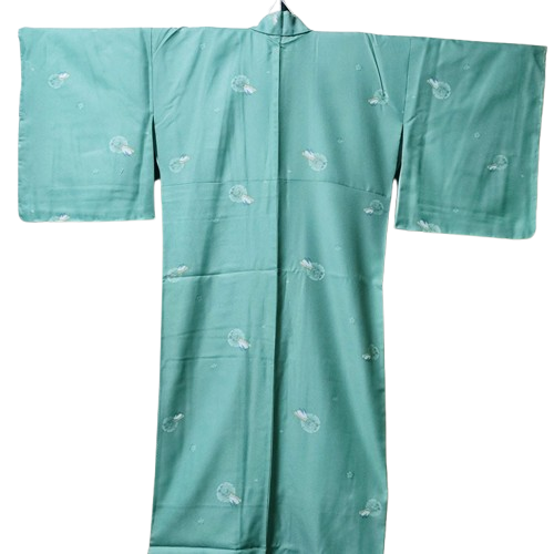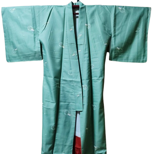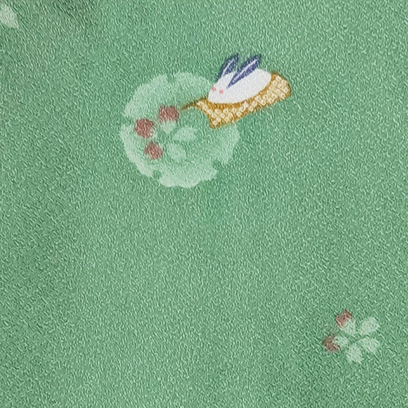 Este kimono está hecho de una refrescante tela verde con estampados de conejos y flores de cerezo.