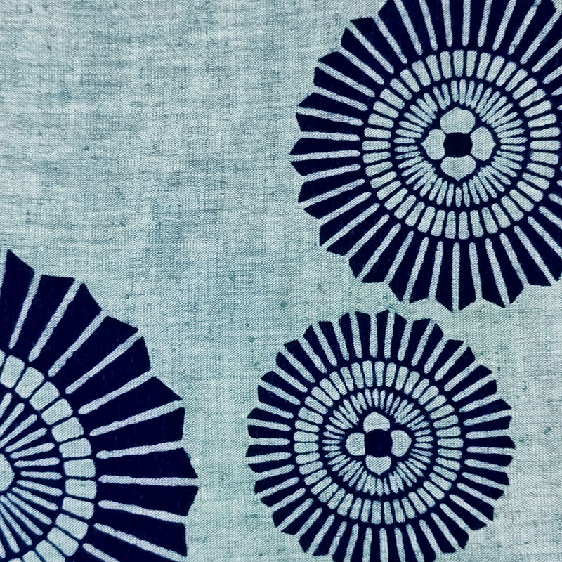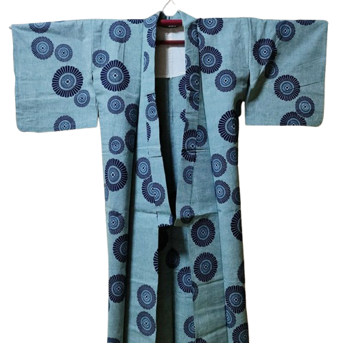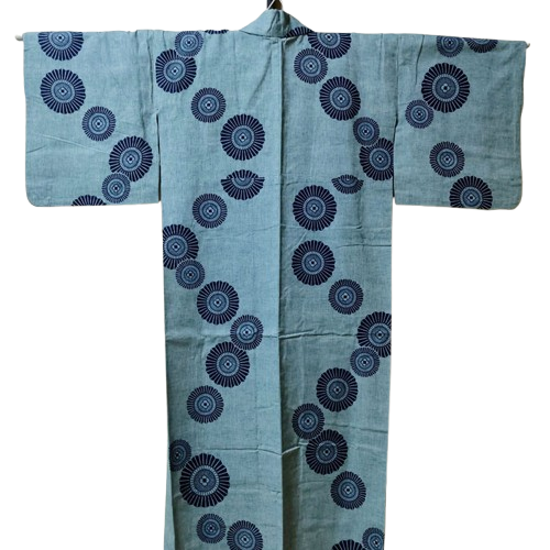 Un yukata con un patrón de paraguas japonés azul marino sobre tela gris azulada.